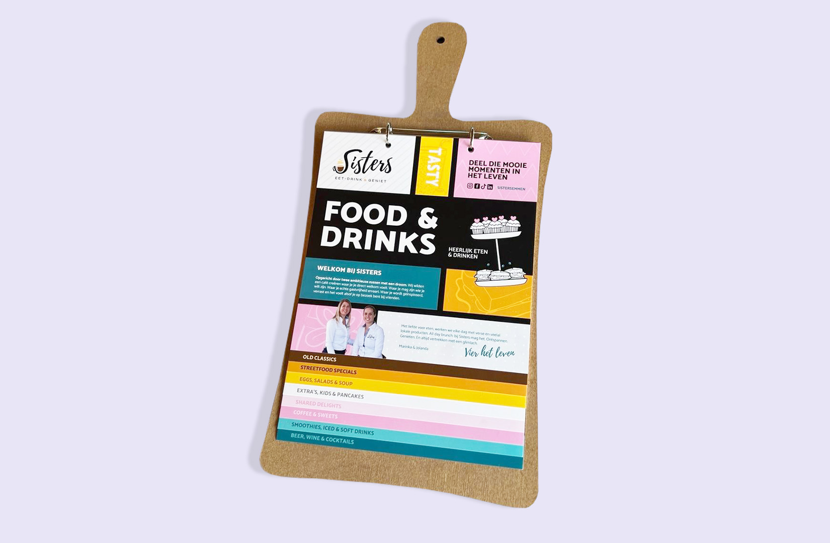 Voor deze nieuwe editie is de menukaart gepresenteerd op een houten snijplank, wat de gerechten direct een ambachtelijke en speelse uitstraling geeft. Het hout versterkt de huiselijke en gezellige sfeer van Sisters en maakt het bekijken van de kaart tot een plezierige ervaring op zich.
